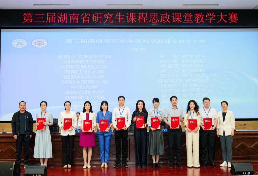 校园网讯 9月20日,由湖南省教育厅主办、湖南中医药大学承办的第三届湖南省研究生课程思政课堂教学大赛圆满落幕。历经多轮激烈角逐,我校选派的三支教师团队全部荣获省级一等奖,获奖率和一等奖数量均排名全省第一。本届大赛历时三个月,共有来自全省21所高校的88门课程参赛。经严格评审,最终决出一等奖23门、二等奖31门、三等奖17门。我校孙小香教师团队的《半导体器件物理》(理工农医类)、侯新兰教师团队的《音乐课程设计...