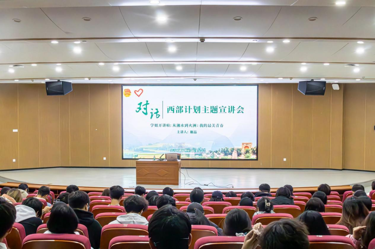校园网讯 近日,校团委启动了“西部计划优秀志愿者返校”系列活动。首场宣讲会特邀现服务于新疆吐鲁番市的西部计划志愿者、我校2025届南湖学院毕业生谢晶返校,为在校300余名同学带来了一场饱含热血与温情的志愿服务经历与感悟分享。宣讲会以“从湘水到火洲:我的最美青春”为主题,号召同学们“到西部去、到基层去”。谢晶结合自身经历,细数在西部服务期间的所见所闻、所感所悟,系统解读了生活补贴保障、升学加分、就业定向...