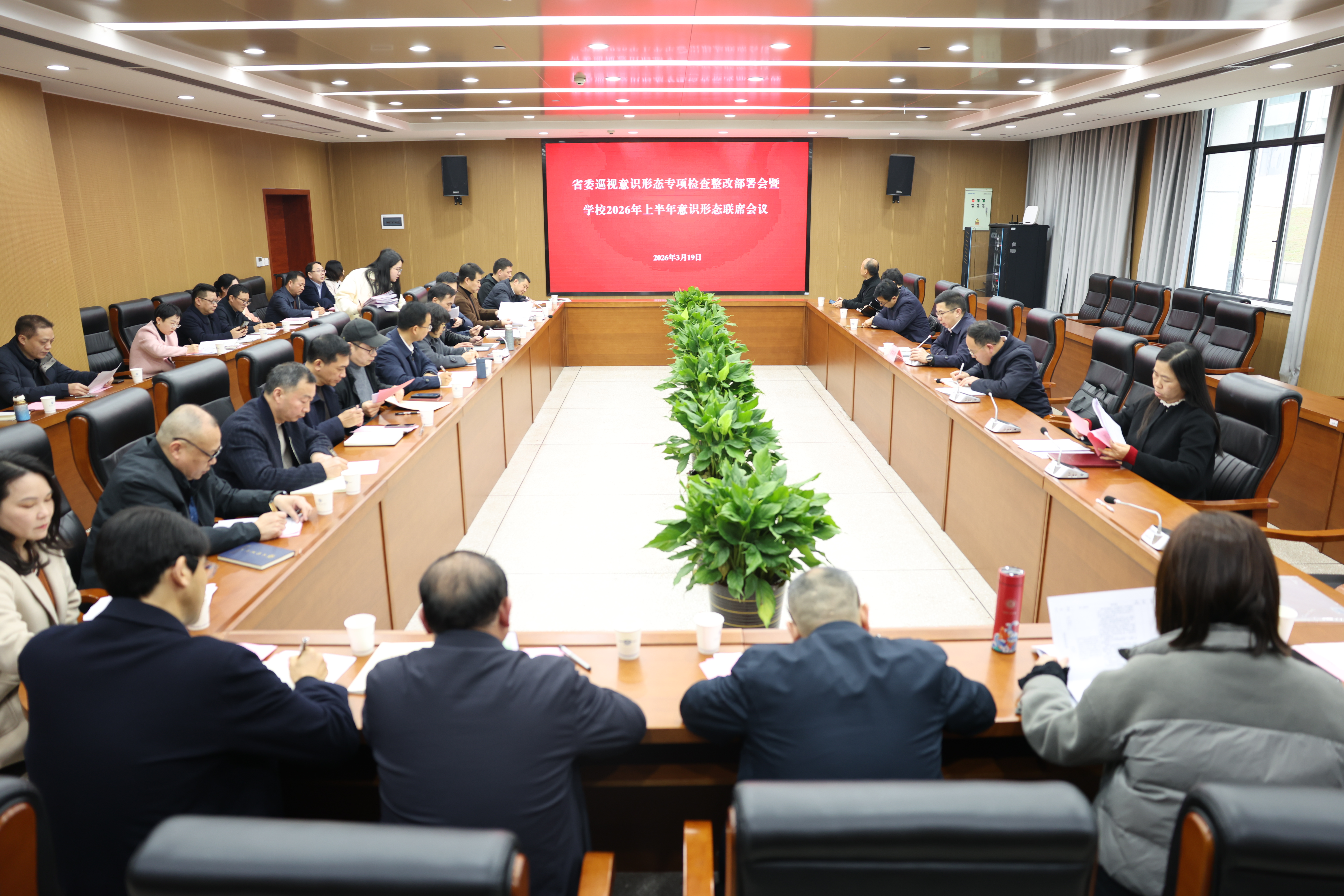 校园网讯 3月19日,学校召开2026年上半年省委巡视意识形态专项检查整改部署会暨学校上半年意识形态联席会议,校党委委员、副校长徐振祥主持会议并讲话。会议强调,要深入学习贯彻习近平总书记关于巡视工作和意识形态工作的重要论述,认真落实省委巡视意识形态专项检查整改工作的部署要求,推动巡视整改取得实实在在的成效。 会上,党政办、教师工作部(人事处)、学生工作部、图书馆、体育学院党委、外国语